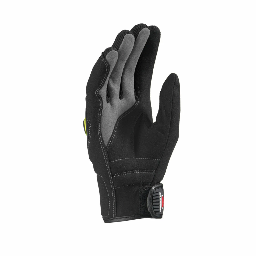 Guanto sportivo estivo in tessuto ventilato. Dorso: tessuto elasticizzato ventilato. Palmo: microfibra anti-scivolo. Tessuto elasticizzato infradito. Rinforzo su laterale guanto.. Rinforzi in TPR (gomma termoplastica) a densità differenziata sulle nocche. Imbottiture su palmo, dorso e laterale guanto. Polso regolabile tramite cinturino, con applicazione iniettata in TPR.