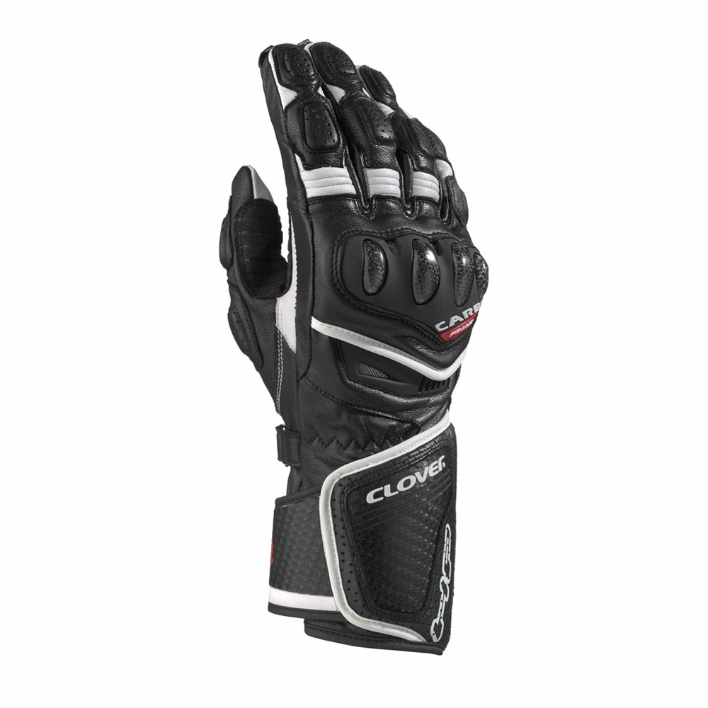 Guanto racing in pelle di canguro. Dorso: pelle bovina. Palmo: pelle di canguro e microfibra anti-scivolo. Guscio composito in carbonio e poliuretano sulle nocche. Rinforzi in gomma termoplastica (TPR) sullo scafoide e dorso. Rinforzi in TPR Carbon look su dorso e lati del polso. Strato di rinforzo su palmo, dita e lato esterno guanto. Doppie cuciture nelle zone più esposte. Imbottiture su palmo e dita. Prese di ventilazione su nocche e dita. Snodo tra nocche e dorso per un maggiore comfort di movimenti. Soffietto elasticizzato sulle dita per migliore flessibilità. Doppio cinturino di regolazione polso e serraggio di sicurezza.